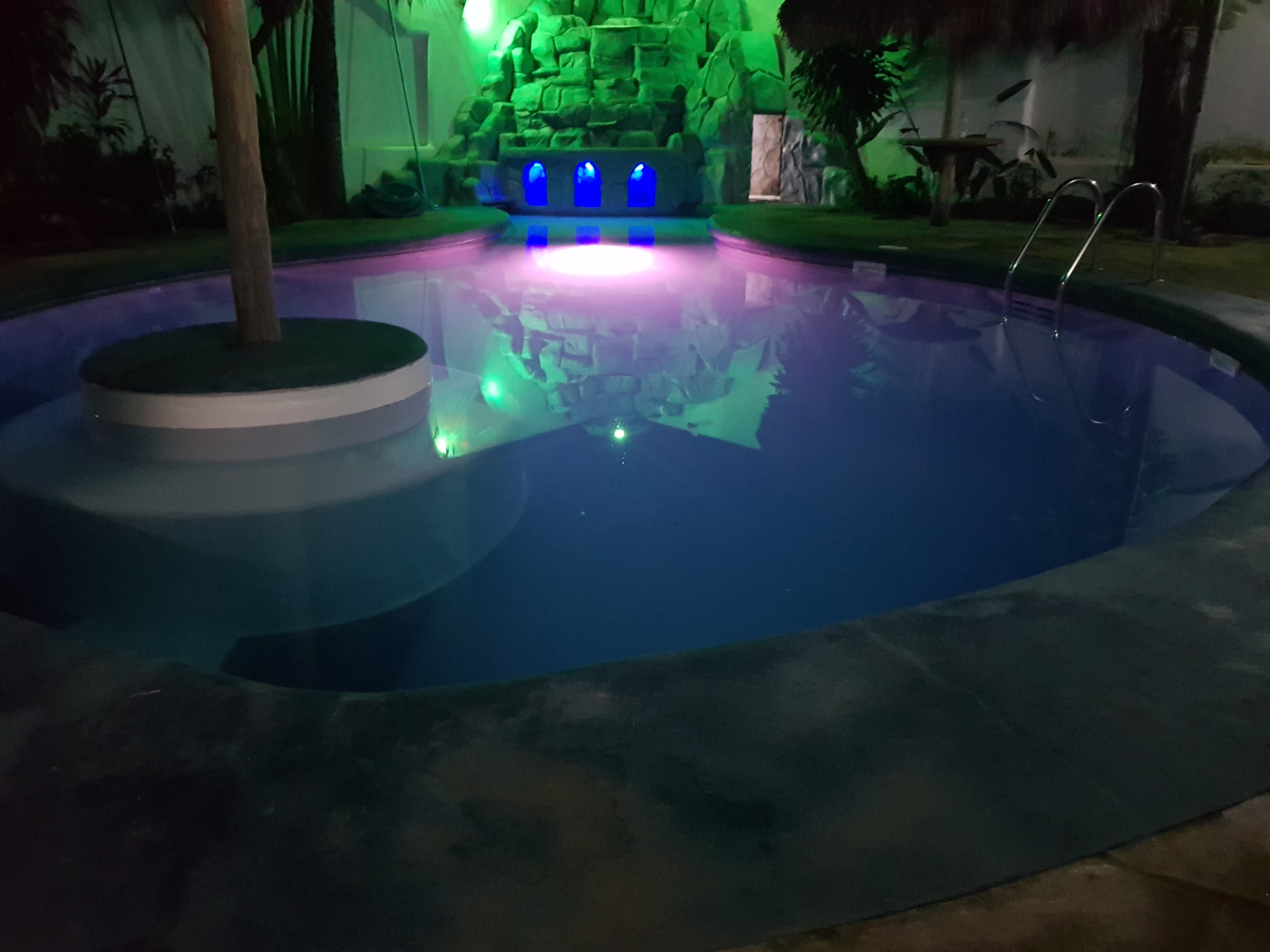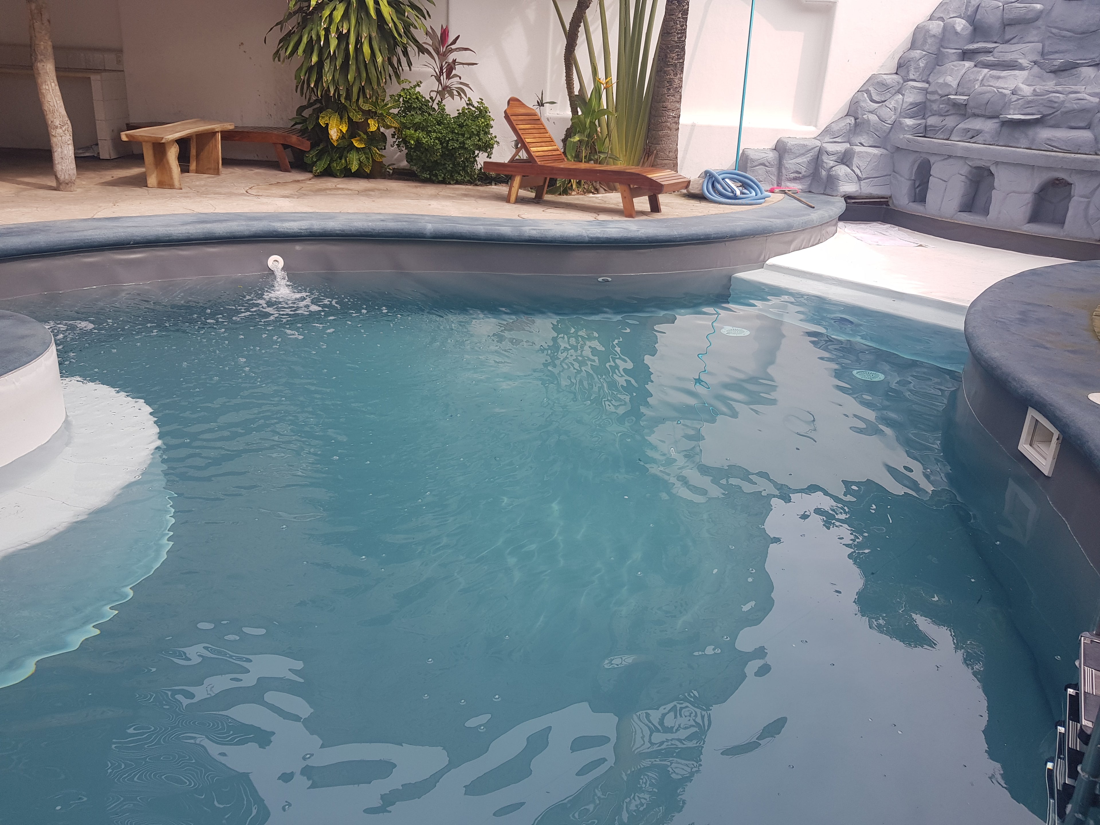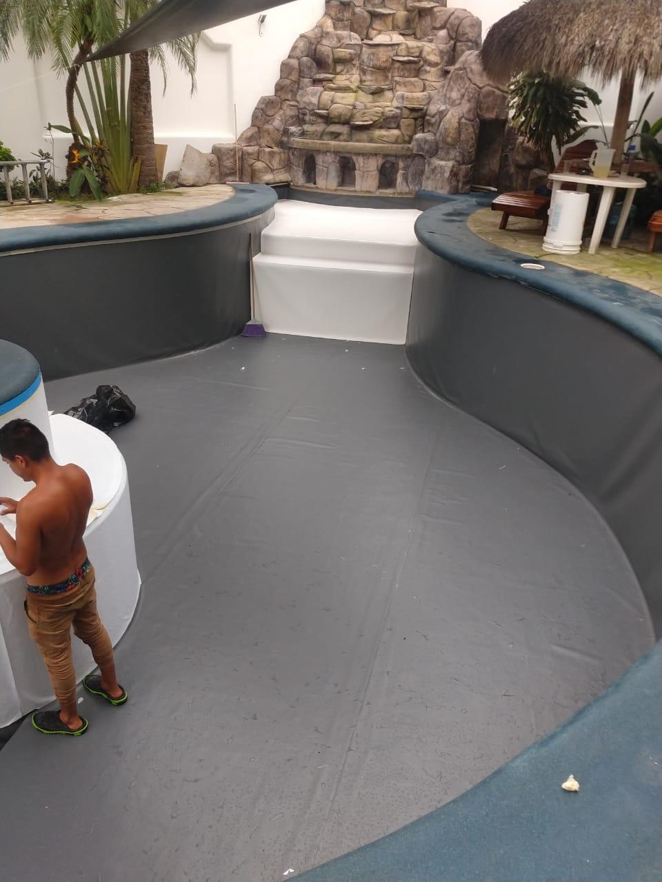 Esta alberca se renovó con muros en membrana Anthacite, piso combinado Blanco, Anthacite y negro, andador recubrimiento Cuarzo natural Azulpacífico